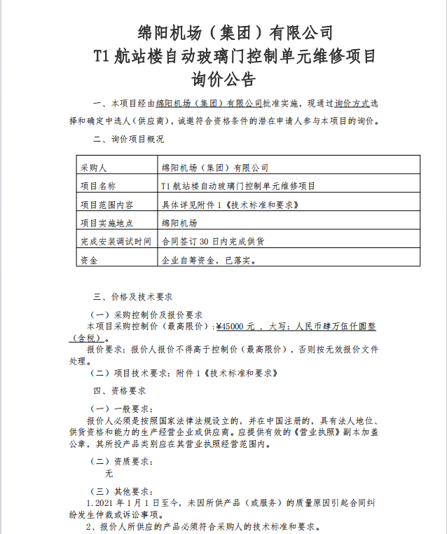 綿陽機(jī)場(集團(tuán))有限公司 T1航站樓自動玻璃門控制單元維修項(xiàng)目詢價公告