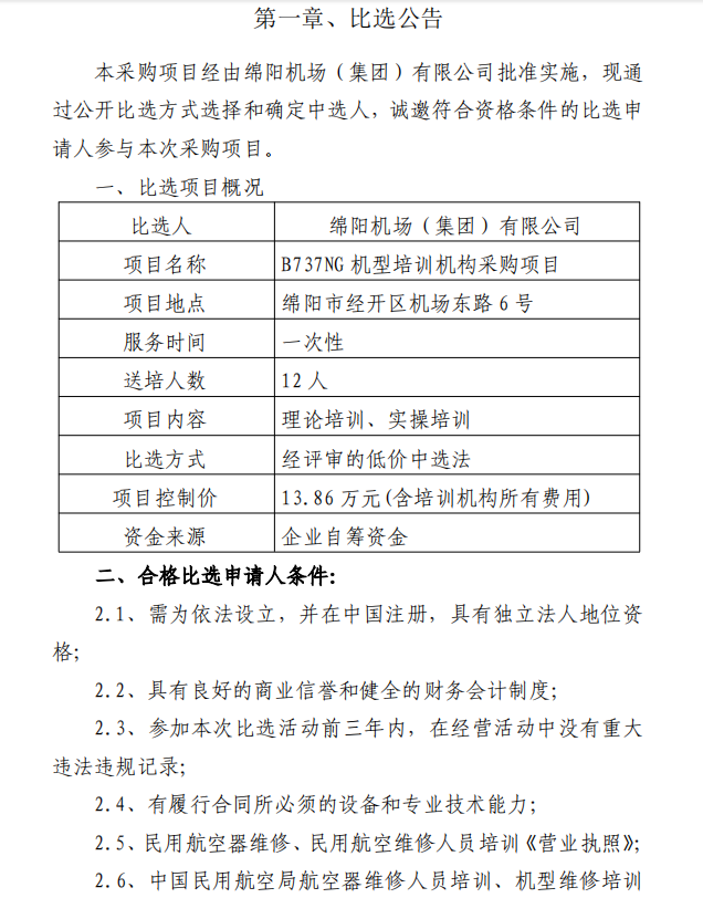綿陽(yáng)機(jī)場(chǎng)B737NG機(jī)型培訓(xùn)機(jī)構(gòu)采購(gòu)項(xiàng)目比選公告